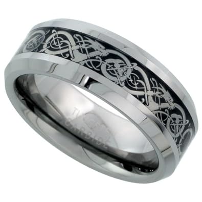 Just received the ring. The background is not black as is pictured. Because of that the dragon inlay is not really defined as well as its pictured. The engraving is also split, not a continuous engraving. There is a big line in ring where the detail is spliced. We wanted the tungsten carbide for the strength of the metal. I was not prepared to see the clear midsection poured over the engraving section of the ring. That really detracts from the "engraving" as instead it looks like a piece of paper was laid into the ring and clear coated. I cant imagine that if you wanted tungsten carbide for the metal strength that the clear coat will last long since its not part of the metal. Overall I was disappointed. I just feel the detail is not as described and it looks like cheap gumball machine jewelry.