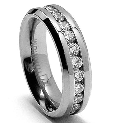 This beautiful ring is 8MM in width and comfort fit. It is high-polish with a matte finish center and has channel set Cubic Zirconia going all the way around the ring. Our rings are hypoallergenic. All rings come with a 100% money back guarantee and a FREE ring box.