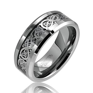 Dragons mean many things to many people. The Celts revered their magic powers and our Celtic Dragon Comfort Fit Black Inlay Tungsten Carbide Mens Wedding Ring will feel like magic when you put it on. The comfort fit rounded edges of this tungsten dragon ring lets you put it on and take it off with ease. Tungsten jewelry is famous for its high-gloss, permanent polish, and scratch-resistant surface. Because it is hypoallergenic, our Tungsten gold ring will not turn your gfingers green. This black inlay Tungsten ring for men is dashing, eye-catching and absolutely durable. If you?re buying our Tungsten celtic ring for a wedding, you?ll know that its beauty is lasting. A Tungsten wedding band says happily ever after with style and panache. Measures: band width: 8mm Weight: 11.4 grams