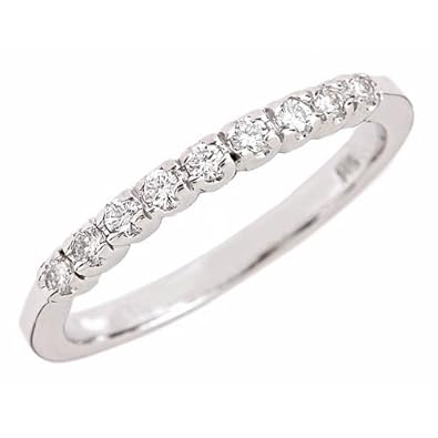 This is a great ring. Received as Christmas gift from husband and daughters. Diamonds are clear, no inclusions and great sparkle. Thin band probably about 2 mm. in size. Looks good alone or paired with engagement ring or anniversary band. Great processing by company - arrived in nice gift box. Would recommend.