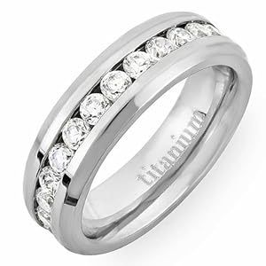 Ring Size 5 to 9 MSRP: $149.99. This 6mm Titainum ring features lovely CZ's that surround the band. A Polish finish gives this ring the perfect finishing touch! This rings quality is unmatched! We have a satisfaction guarantee so be sure to get the details from one of our friendly customer service representatives. All ring come with a 100% Money Back Guarantee and a FREE ring Gift Box. SKU T010-7