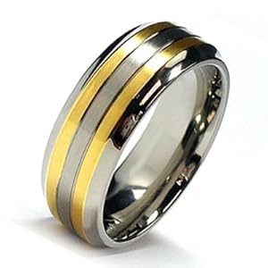 This classic Titanium and 18k gold plated band is one of a kind! 8mm in width, features two 18k gold plated lines in a high polished finish. The top is flat with beveled edges for a comfortable fit. Comfortable and classic, as well as strong and lightweight. This wedding band will compliment any style and provides timeless elegance. Hand-crafted, lightweight, and durable make this Titanium and triple gold band is perfect for an upcoming engagement, anniversary gift or to update/replace an existing wedding ring. Titanium jewelry is high quality, good color and luster. Titanium jewelry is lightweight, durable and strong. What's more, it is very safe for our body!