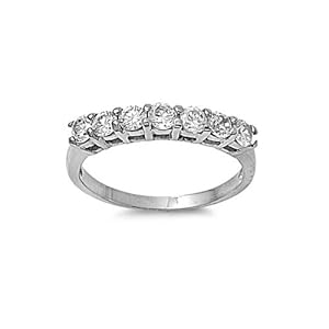 This gorgeous ring showcases seven clear round-cut diamond cubic zirconias. The stones are 2mm in diameter making a total of 1.26 carat weight. This band is made of stainless steel so it won't cause skin irritation or allergies. Stainless steel wedding rings are quickly on the rise because of their strength and durability, as well as their affordability. Stainless steel jewelry has a good quality that can substitute your real gold or platinum jewelry for every day use. You choose the size: 5, 6, 7, 8, 9, 10.