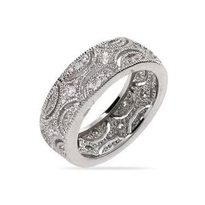 Get old fashioned elegance with this Victorian Style Wedding Band. This beautiful sterling silver wedding band is 1/3 inch wide and holds a lovely intricate vintage style design of 1 mm and 2 mm diamond cubic zirconias. This ring makes a lovely casual accessory or a unique choice of wedding ring!